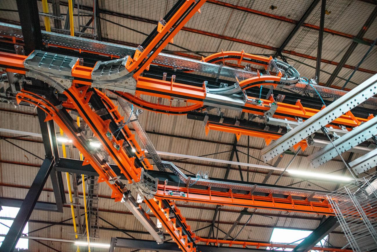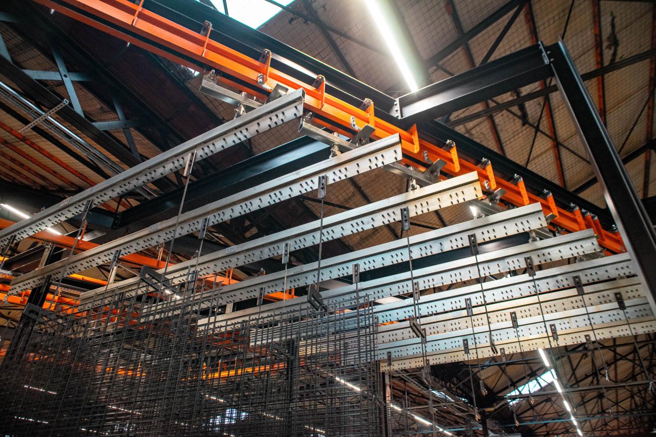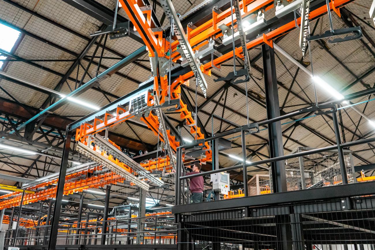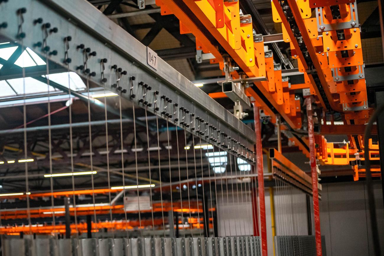 This advanced and well-designed overhead conveyor system transports fencing equipment produced by Betafence.The products, which measure up to 5.1 meters in length, 0.3 meters in width, 3.2 meters in height, and weigh 750kgs, are hung from loadbars specifically designed for this purpose.