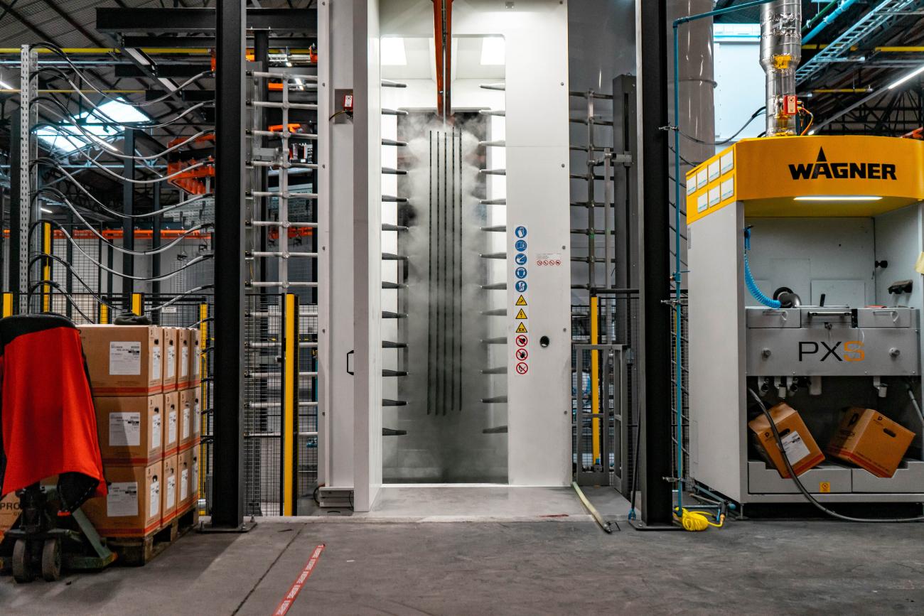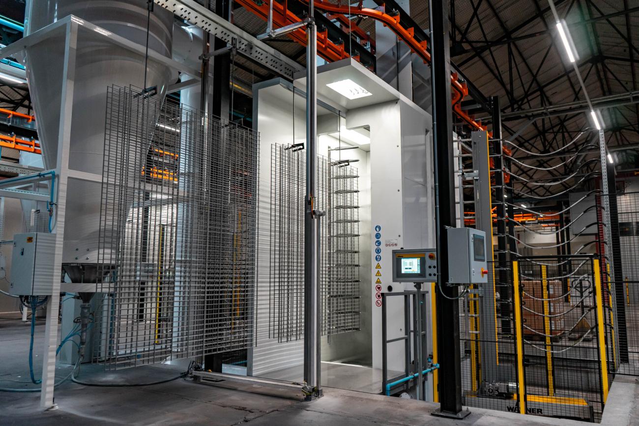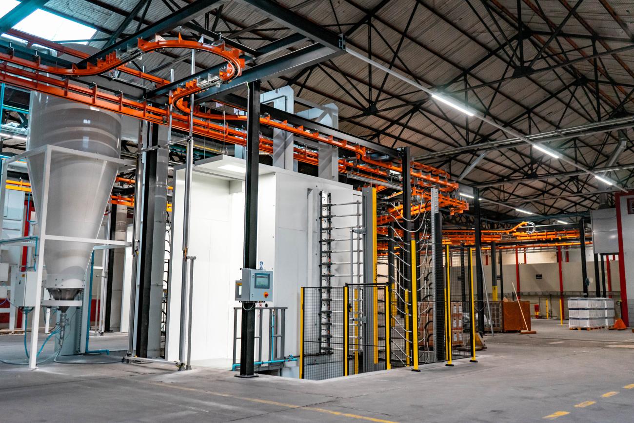 These products undergo various stages of production, including pretreatment cabins, powder coating booths, and drying ovens, with multiple buffers for efficient storage and re-coating.