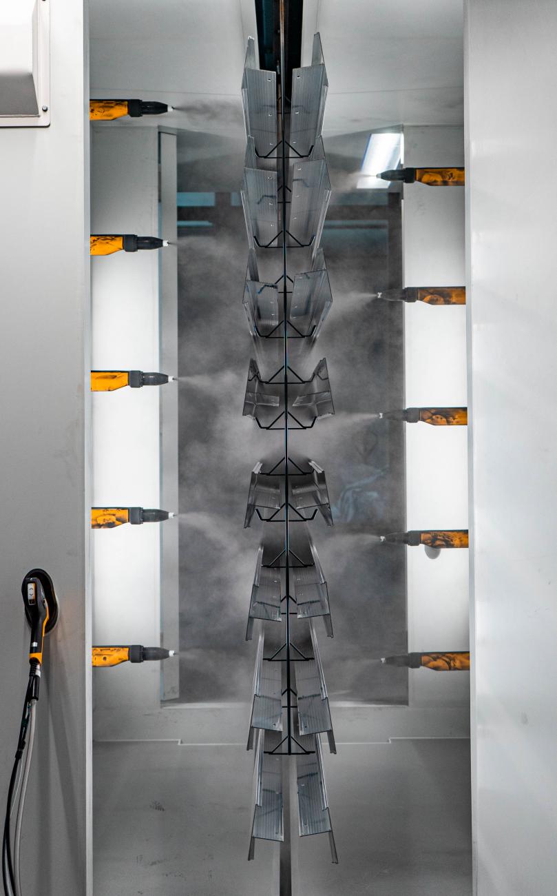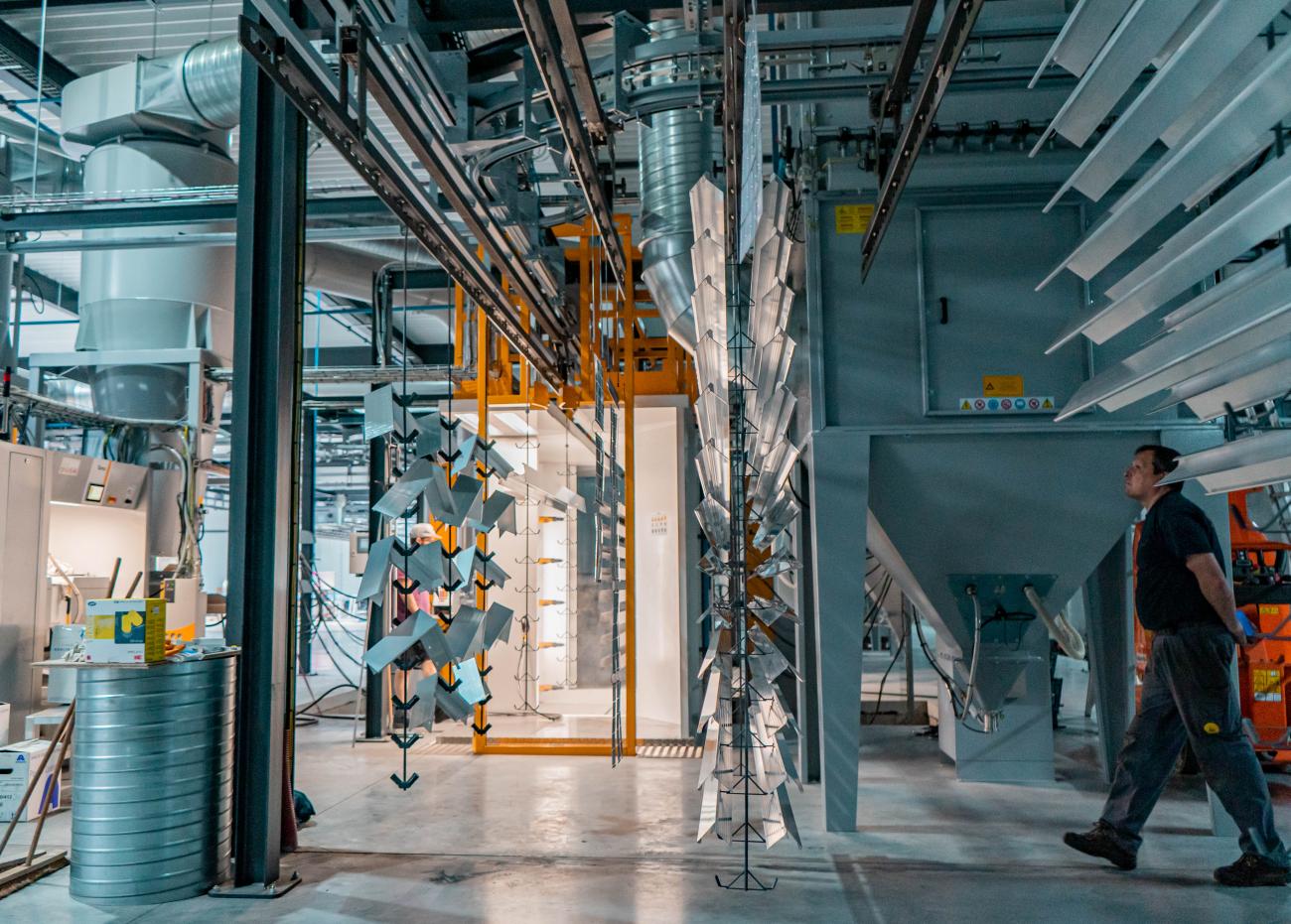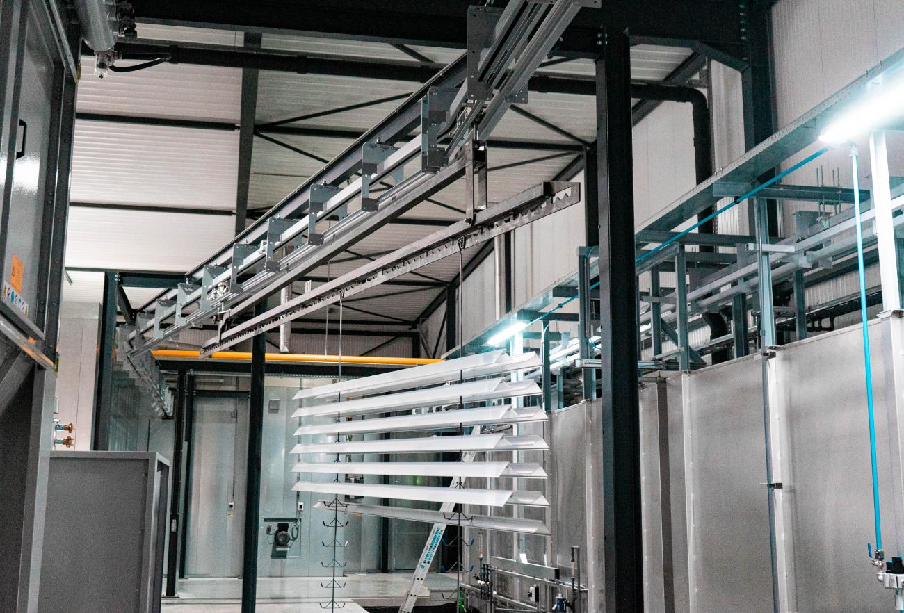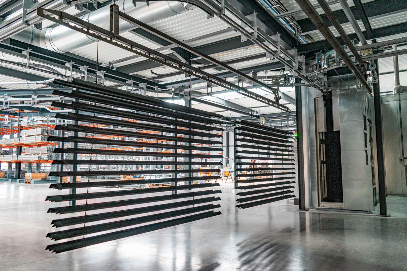 The overhead conveyor goes through several pre-treatment units, ovens and powdercoating booths before drying off in a buffer.