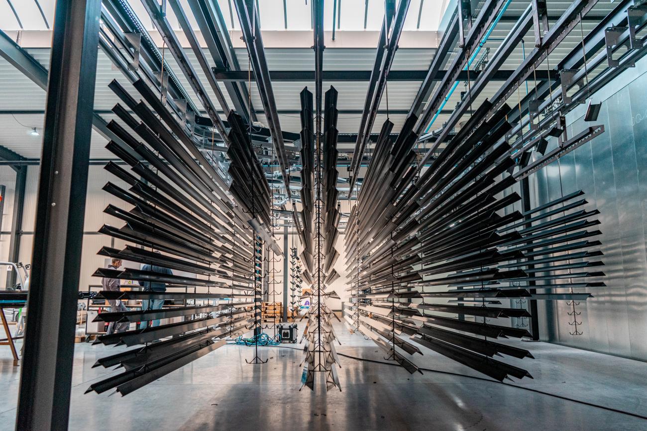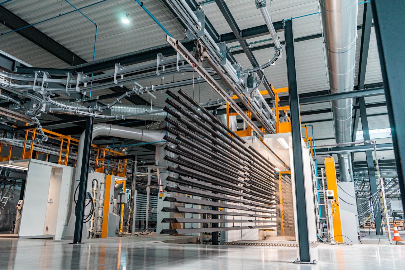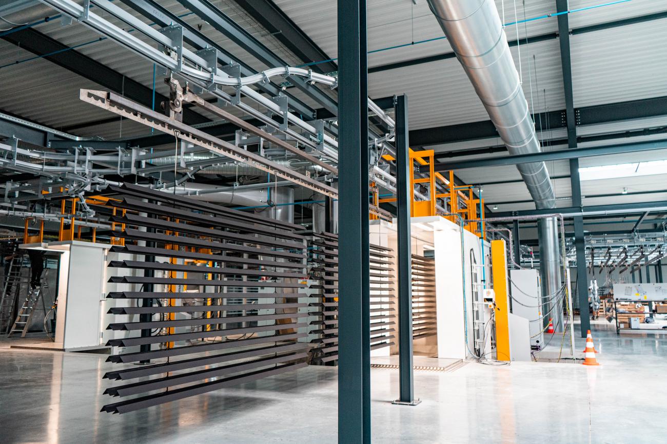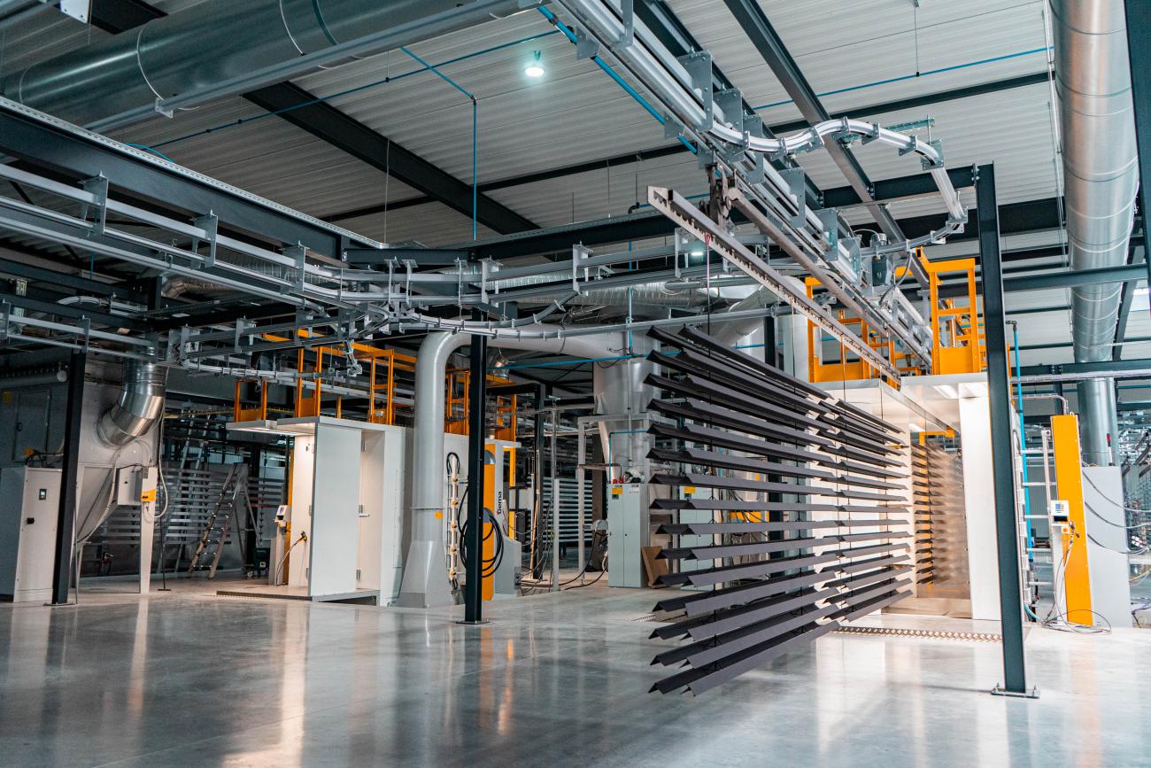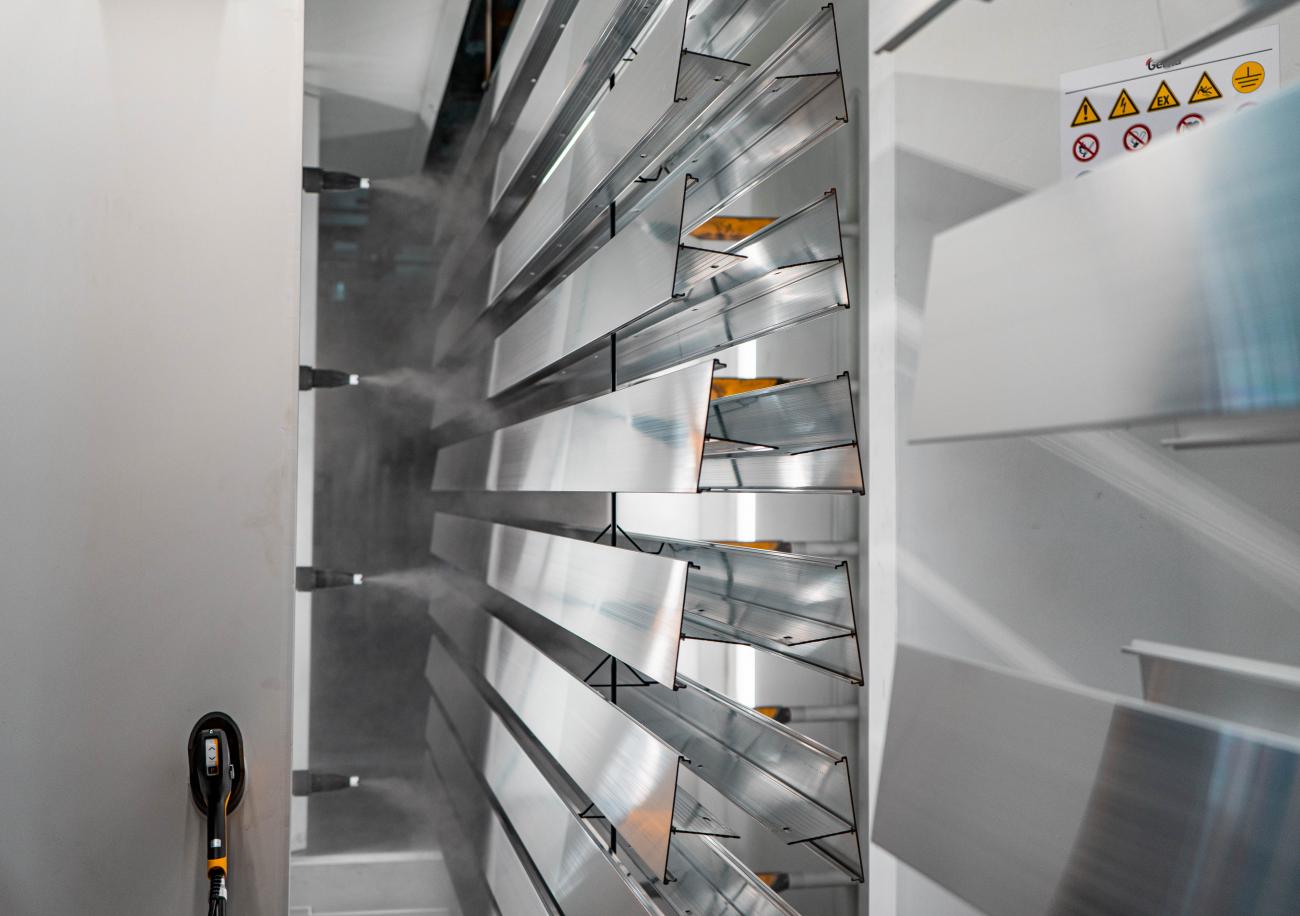 The overhead conveyor goes through several pre-treatment units, ovens and powdercoating booths before drying off in a buffer.