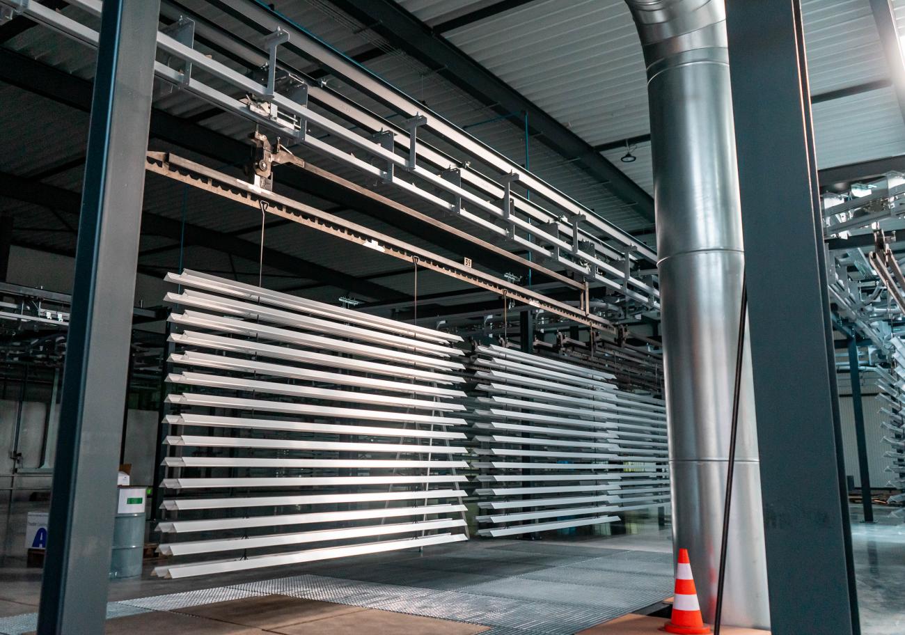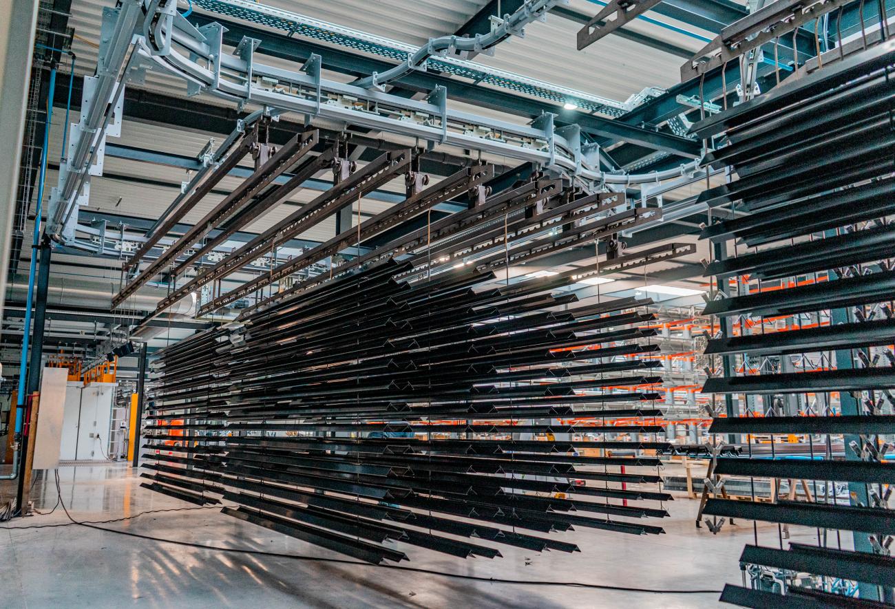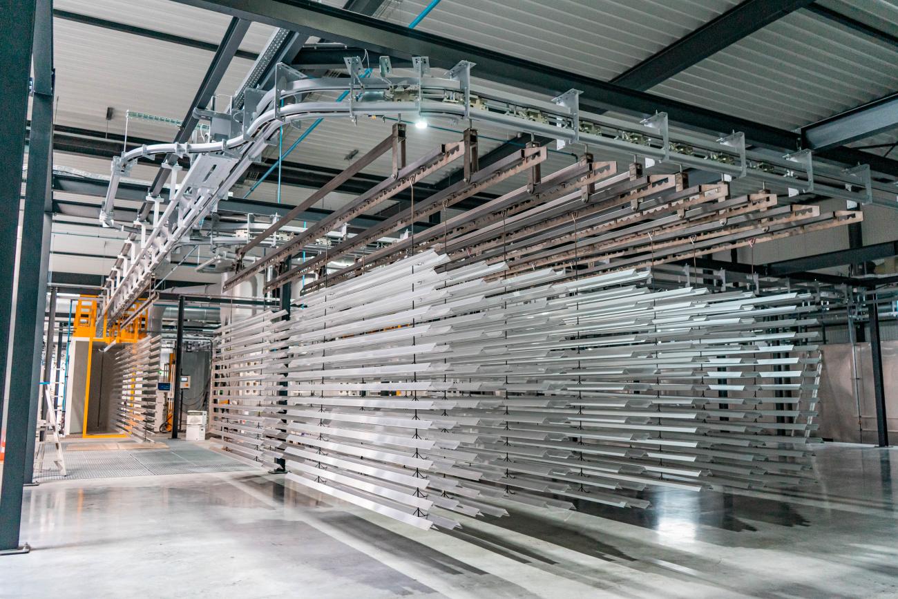 Systems like this are widely used in the powder coating industry, as it makes it easy to load, pre-treat, heat treat and powder coat profiles and other parts on a bigger scale. The traverses have different product hangers that can be used to carry products of different shapes and sizes.