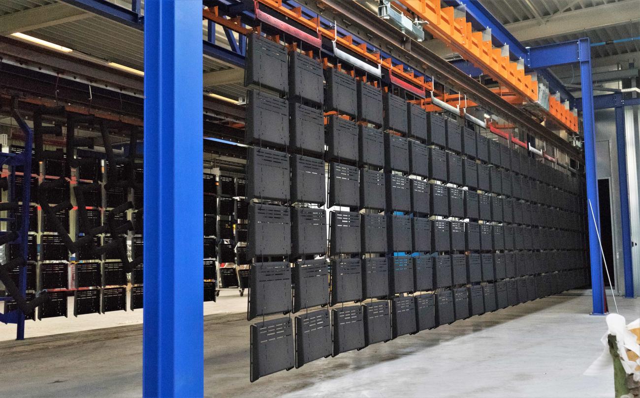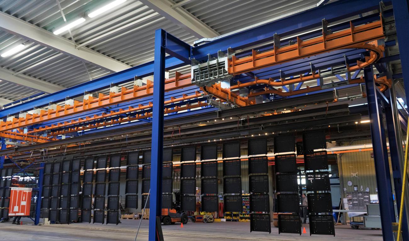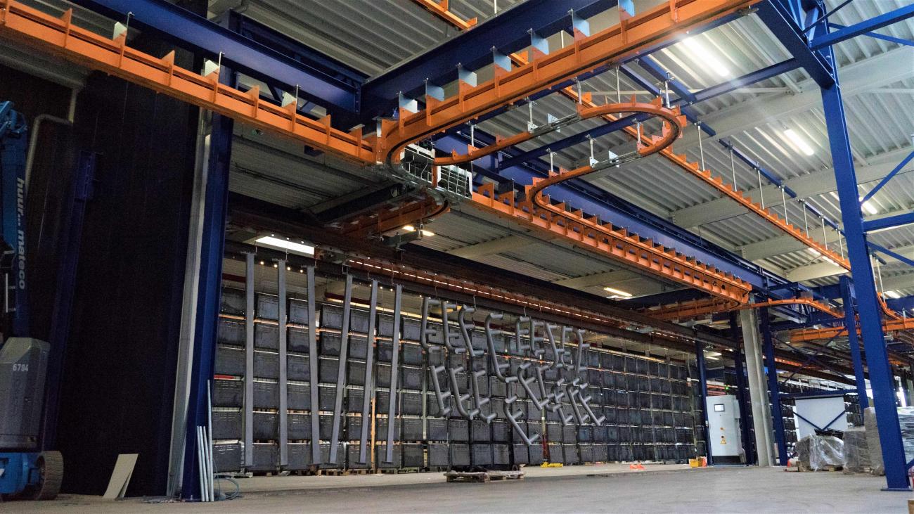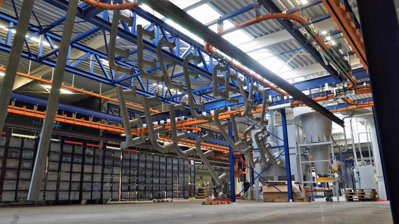 The T5 is our biggest Power and Free overhead system and can handle loads of up to 5000 kgs*. This system at Geuze Metaalconserveren BV has been custom built to suit the requirements of their powder coating processes, with the track being able to carry the product through powder spray cabins and heating ovens.