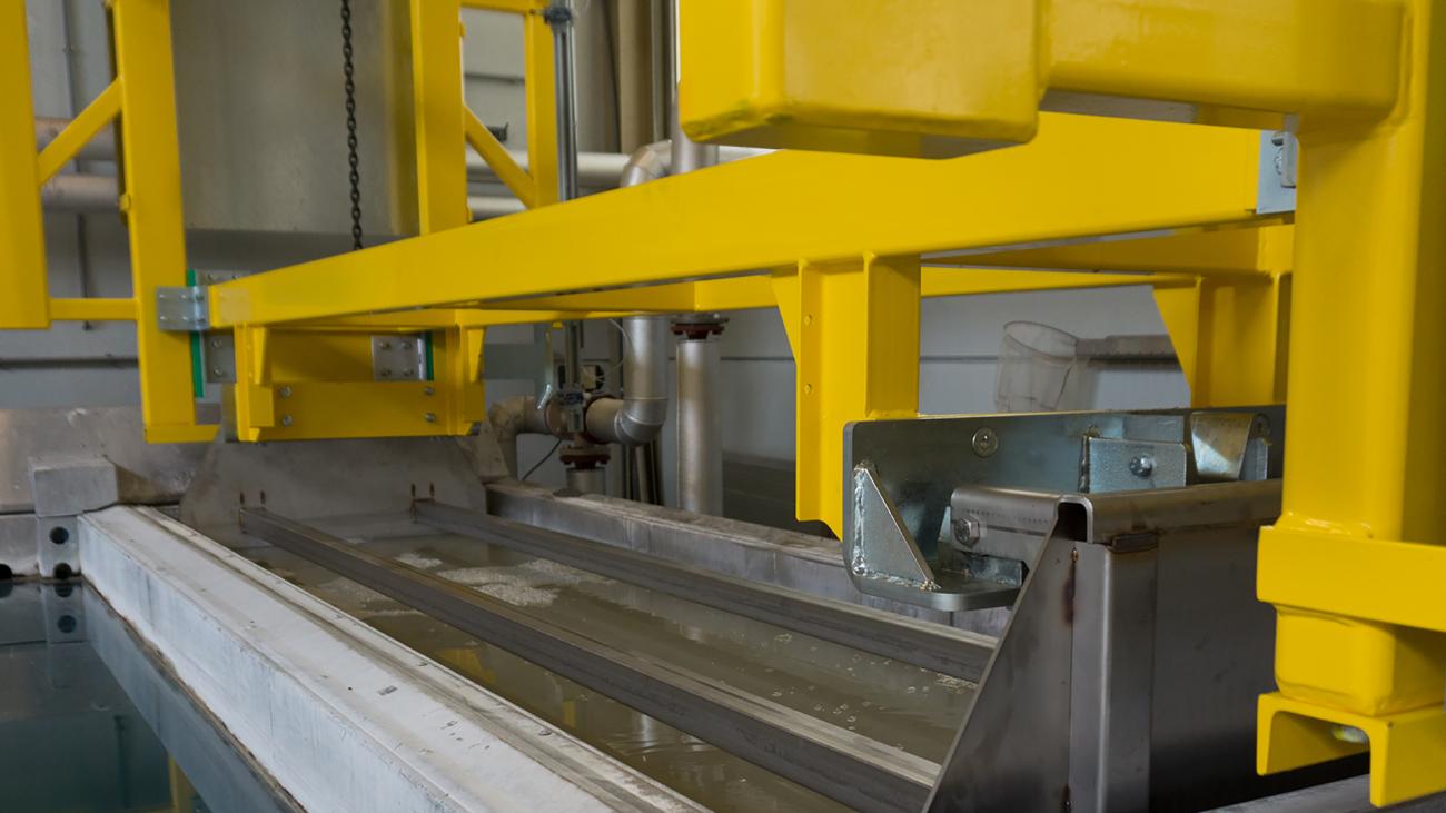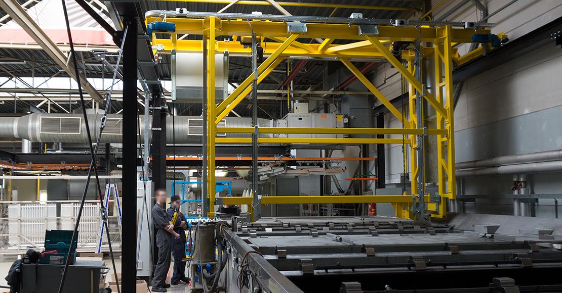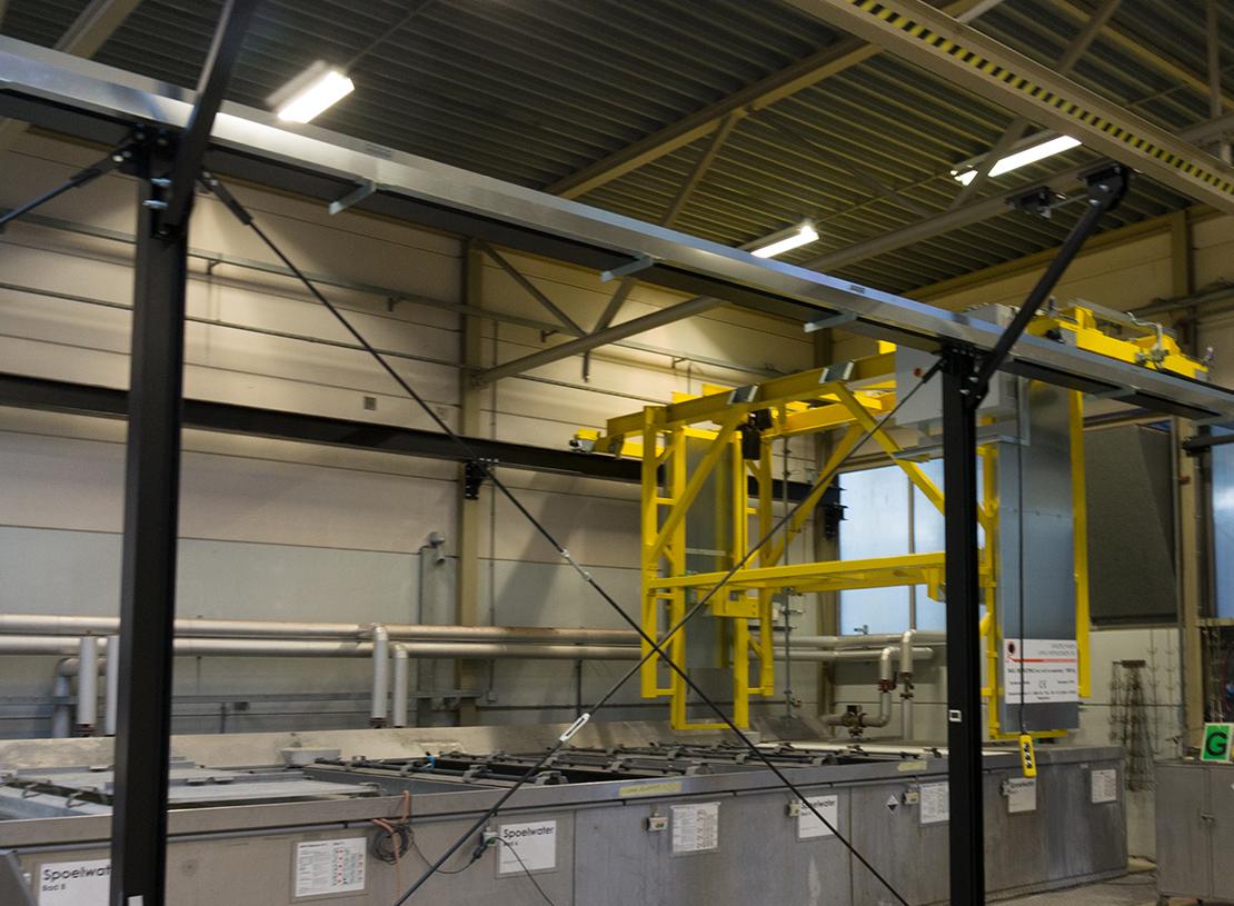 Les grues de cuves d'immersion sont utilisées pour manipuler les produits dans un processus de prétraitement à base de bain. La grue peut fonctionner de manière autonome ou être intégrée à un monorail ou à un système de convoyeur aérien motorisé et libre où les barres de charge transportant les produits sont automatiquement reprises par le convoyeur. Une fois le processus de prétraitement terminé, les barres de charge sont remises par la grue au système de convoyage pour poursuivre le processus de traitement de surface.