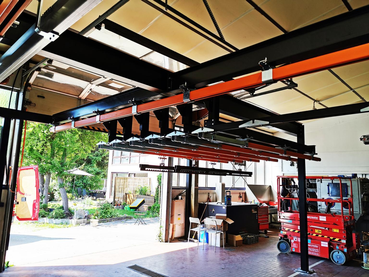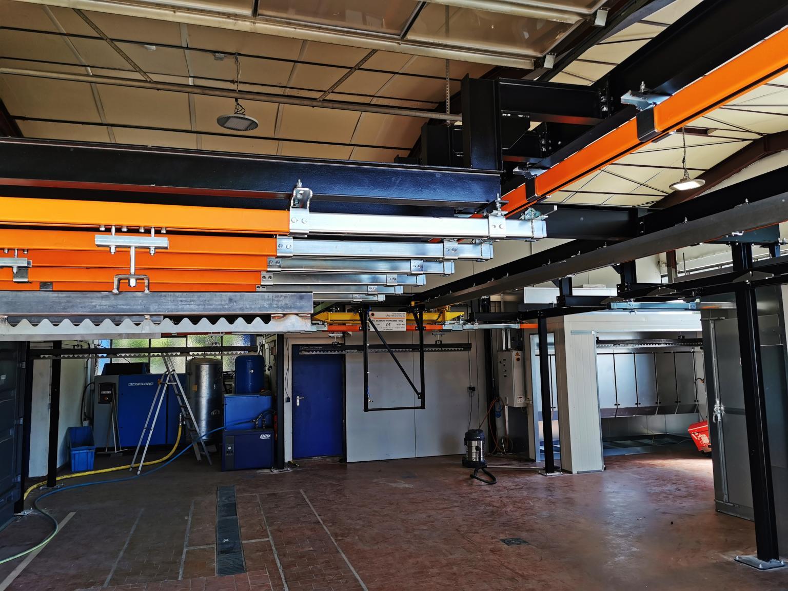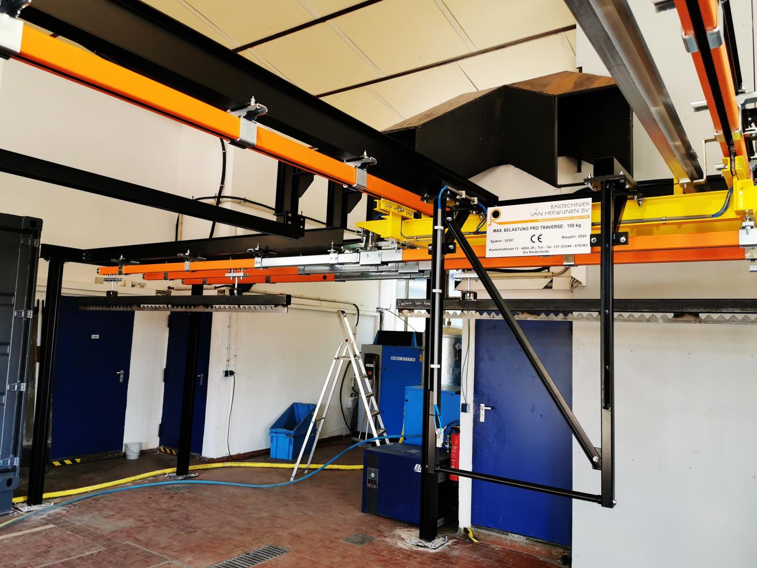 In cooperation with Glasbeek Finish B.V., Railtechniek van Herwijnen BV supplied a cassette monorail system to S&P in Germany. This system offers the possibility of powder coating long products. The advantage is that the system can be housed in a compact space.