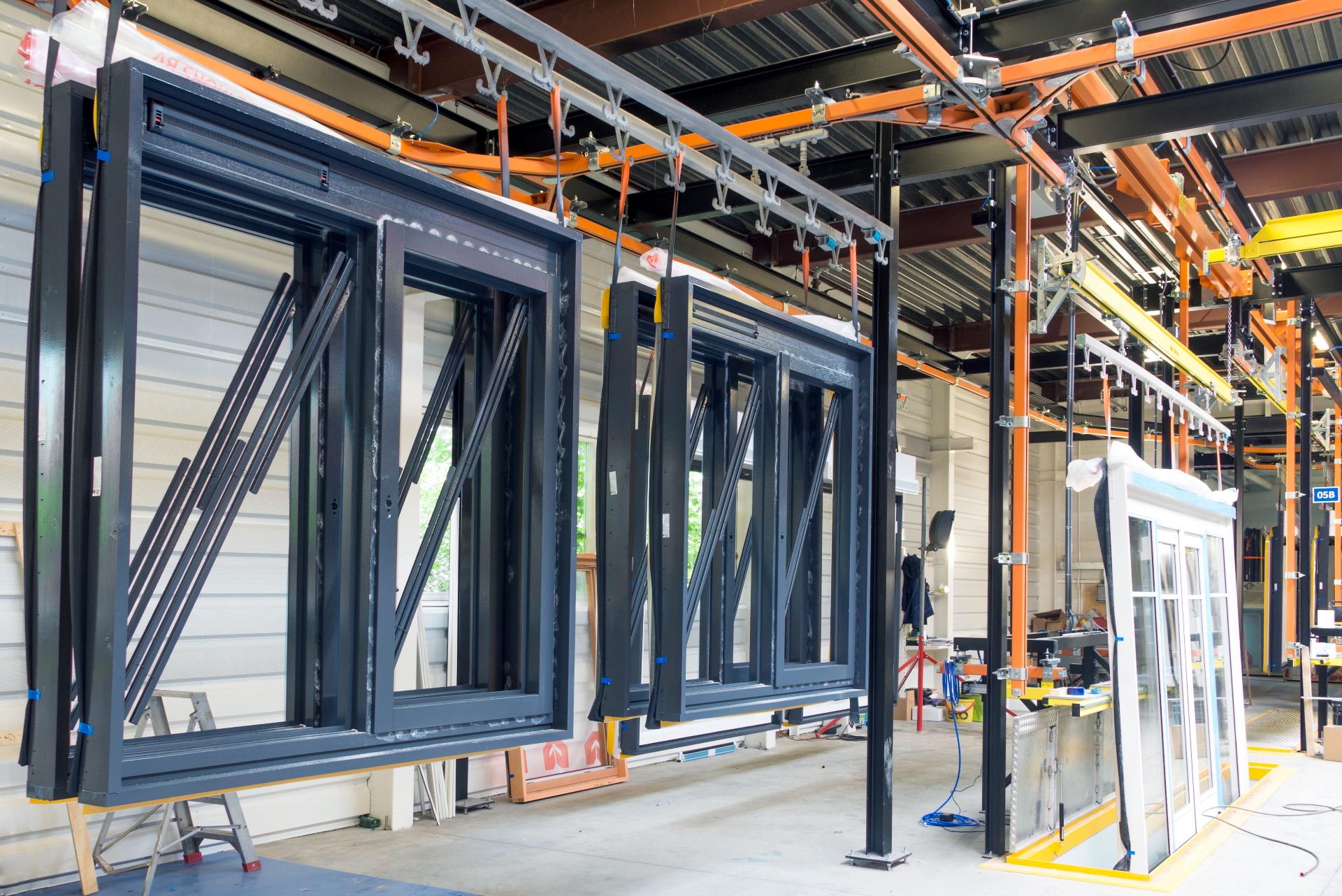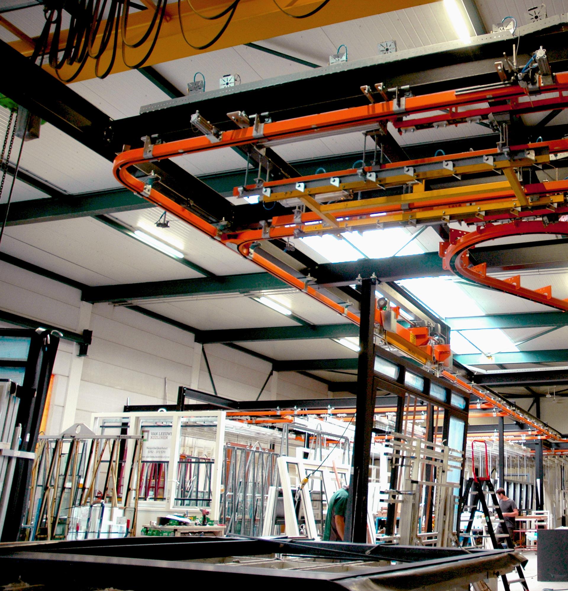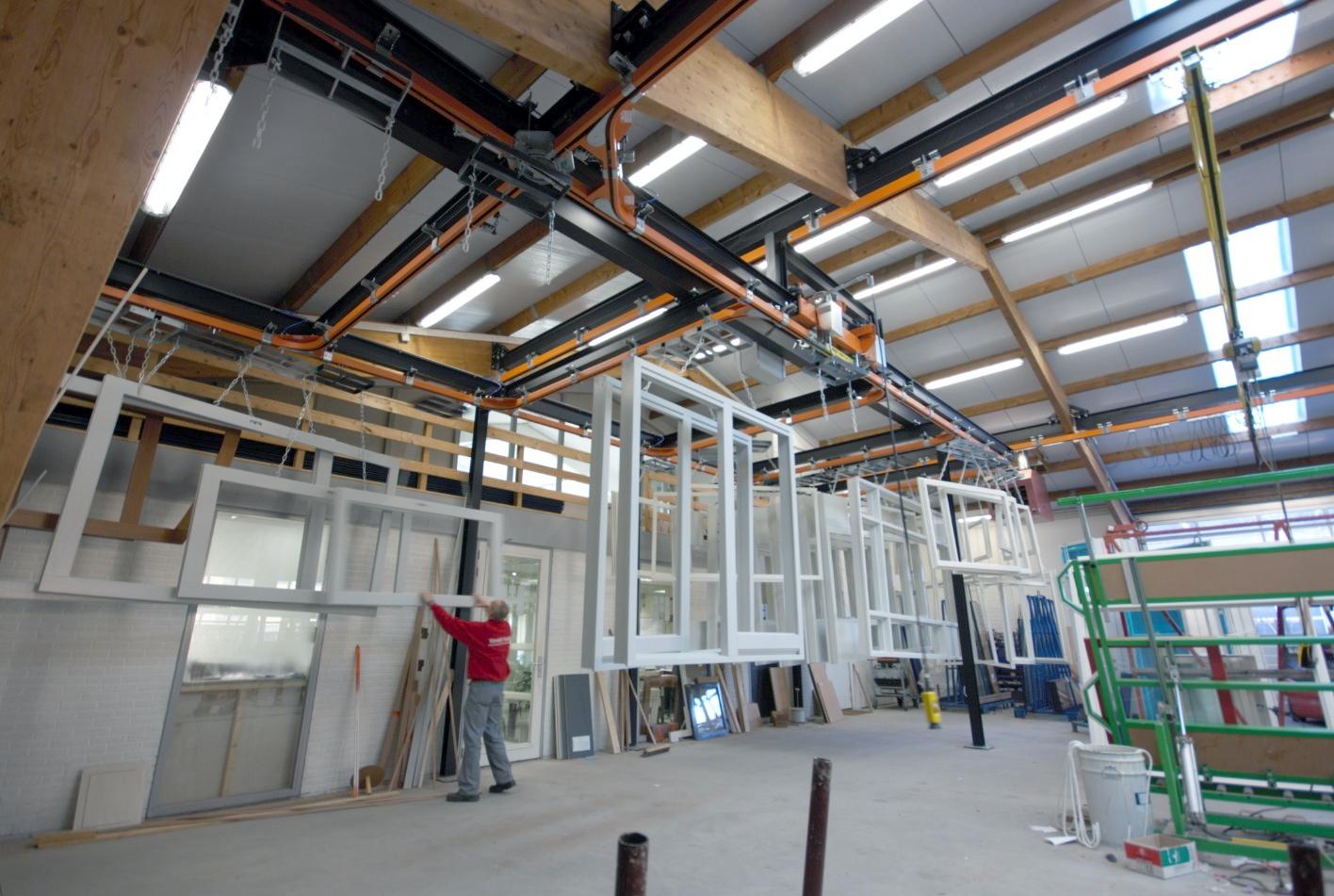 The most commonly used overhead conveyor system for moving wooden products such as window frames and doors is the manual monorail system. This system is relatively simple, has an equally long service life and requires minimal maintenance.